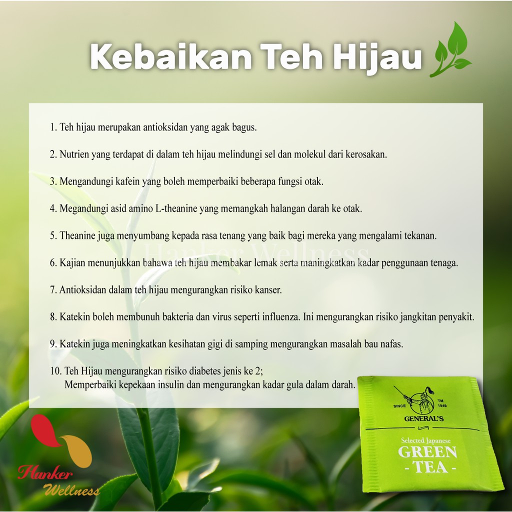 Green tea dapat mengaontrol. Pengambilan teh hijau minima 100ml setiap hari juga mempunyai kebaikan jangka panjang seperti menenangkan minda dan mengurangkan risiko penyakit demensia. Mencegah Risiko Diabetes 5.